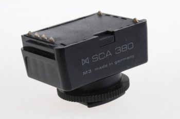 - SCA 301: Este es el adaptador de zapata de flash estándar y más simple, válido para cualquier zapata con contacto central. Con él no funcionará la capacidad TTL del flash ni el zoom del cabezal del flash pero podremos usarlo en manual o en uno de sus diafragmas automáticos. También tiene un agujero donde podemos conectarle un jack de 2.5 mm con un cable asequible en cualquier tienda de fotografía si nuestra cámara dispone de conexión PC-Sync.