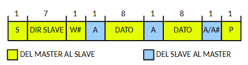 A: ReconocimientoACK/A#: No reconocimiento,No ACK.S: Condición de inicioSTART/P: Condición de paradaSTOP.R: Modo lectura (1) /W#: Modo escritura (0).
