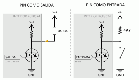 - Cuando el pin del PCF8574 actúa como entrada deberemos ponerlo siempre a HIGH. En estas condiciones, la resistencia interna de pull-up limita la corriente de pérdidas a 100 uA. Al conectar una carga, deberemos usar una resistencia de pull-up, igual que hacemos siempre que leemos un pulsador.