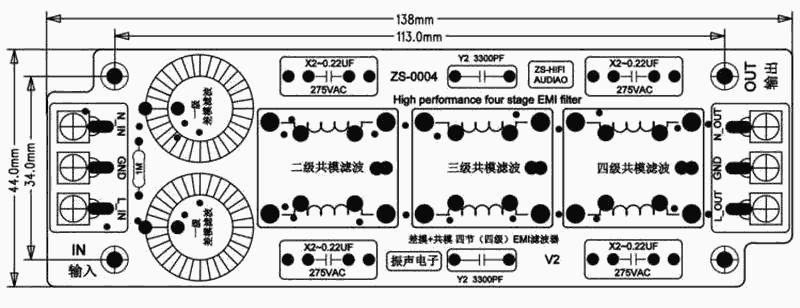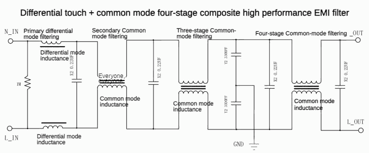 - 2) Se utiliza un conjunto de filtros de modo diferencial y dos inductores diferenciales para realizar el filtrado de modo diferencial en la fuente de alimentación de CA para suprimir la interferencia de frecuencia media a alta.