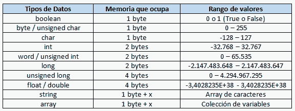 //entero, 16 bits, de -32,768 a 32,767 int variable = 100; //entero, 16 bits, de 0 a 65535 (excepto en Due, donde son 32 bits) unsigned int variable = 100; //entero, 16 bits, de 0 a 65535 short variable = 100; //entero, 32 bits, de -2,147,483,648 a 2,147,483,647 long variable = 100000L; //entero, 32bits, de 0 a 4,294,967,295 unsigned long variable = 100000L;