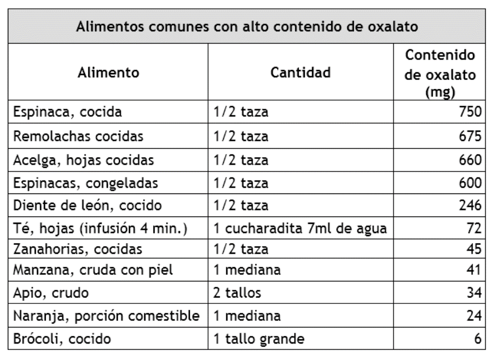 - Para evitar la formación de cálculos renales oxalato cálcico debes reducir al máximo el consumo de alimentos que contienen oxalato como: té (690 mg/100g), café (200 mg/100g), espinacas (750 mg/ 100 g), remolacha (675 mg/100g), acelgas (645 mg/100g), cacao en polvo (623 mg/100g), pimiento (419 mg/100g), germen de trigo (269 mg/100g), frutos secos (185 mg/100g), chocolate negro (117 mg/100g), puerro (89 mg/100g), uva (88 mg/100g), brécol (60 mg/100g), coliflor (50 mg/100g), frambuesas (53 mg/100g), café en polvo (33 mg/100g) y otros alimentos con menor concentración de oxalatos como calabaza, berenjena, fresas, moras, pasas, macedonia enlatada, cerveza.