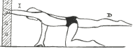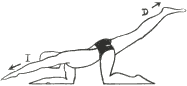 En cuadripedia, brazo izquierdo extendido horizontalmente, mano cogida a la espaldera, elevación de la pierna derecha extendida y estiramiento hacia atrás.