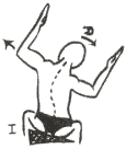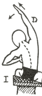 Sentado a horcajadas sobre el banco. Nalga izquierda elevada, mano derecha por encima del hombro, la izquierda apoyando sobre el tórax lateralmente y atrás, extensión del brazo derecho, estiramiento del mismo hacia arriba y ligera inclinación lateral a la izquierda, inspirando.