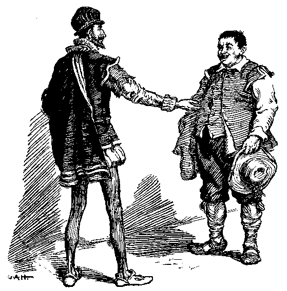 En este tiempo, solicitó don Quijote a un labrador vecino suyo, hombre de bien -si es que este título se puede dar al que es pobre-, pero de muy poca sal en la mollera. En resolución, tanto le dijo, tanto le persuadió y prometió, que el pobre villano se determinó de salirse con él y servirle de escudero. Decíale, entre otras cosas, don Quijote que se dispusiese a ir con él de buena gana, porque tal vez le podía suceder aventura que ganase, en quítame allá esas pajas, alguna ínsula, y le dejase a él por gobernador della. Con estas promesas y otras tales, Sancho Panza, que así se llamaba el labrador, dejó su mujer y hijos y asentó por escudero de su vecino.