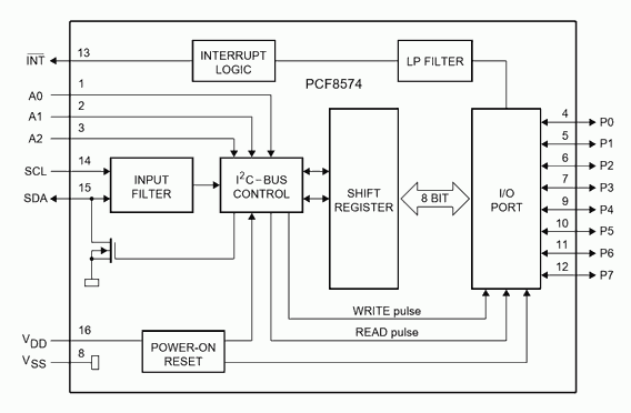 El PCF8574 incorpora 8 pines cuasidireccionales basados en salidas CMOS en configuración drenador abierto. Esto significa que pueden ser empleados tanto como entradas como salidas.