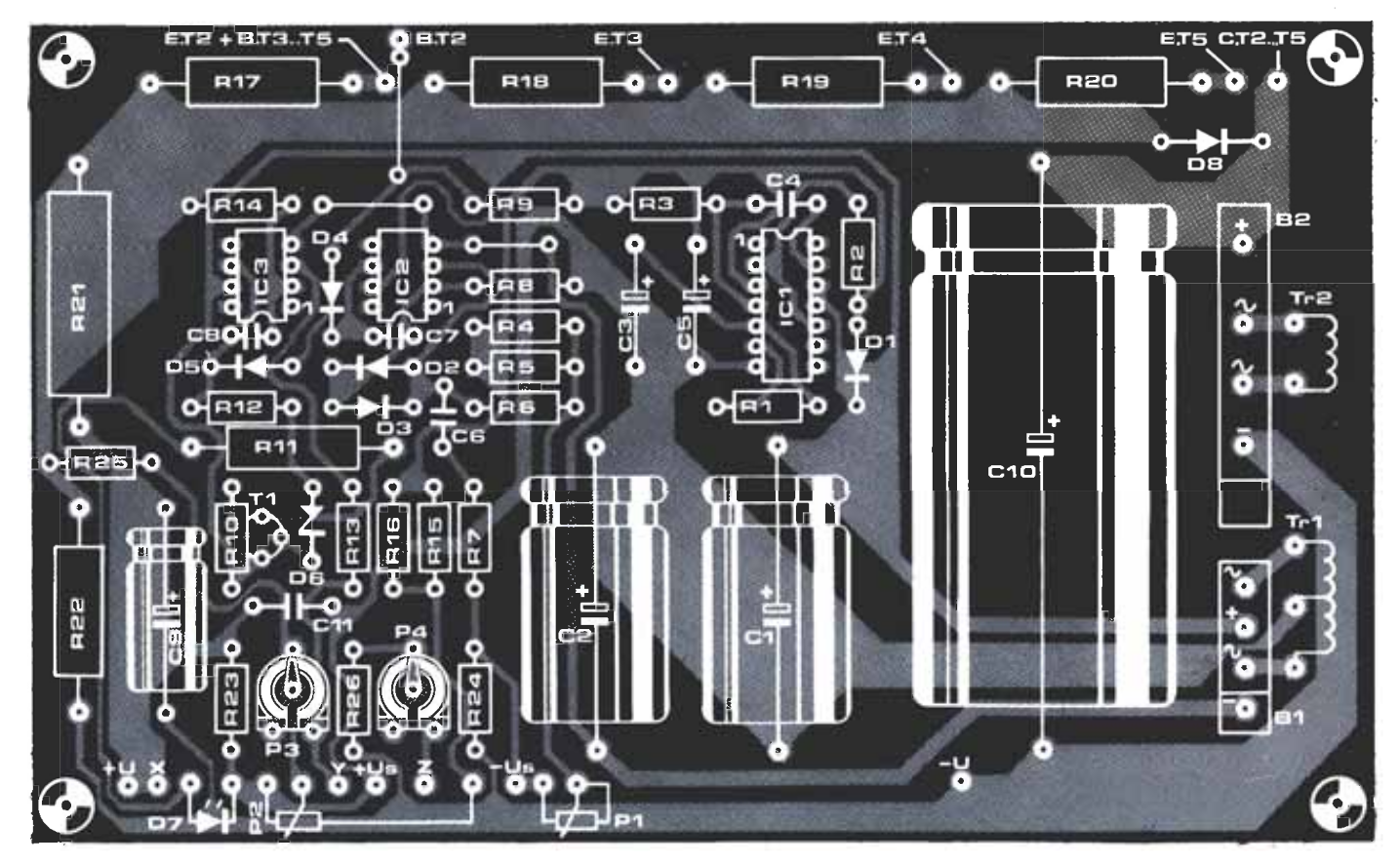 - Las resistencias R4 y R16 se montan durante el procedimiento de ajuste, pues sus valores dependerán de las magnitudes máximas de la tensión y corriente de salida. Por este motivo, no deberá montarse la placa de circuito impreso en la caja del aparato hasta que se haya realizado la prueba y la calibración.