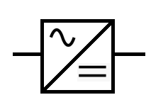- El símbolo empleado para representar una fuente de alimentación en un esquema eléctrico es el que se ve a continuación. Como se puede ver, hace referencia a su función de convertir CA en CC.