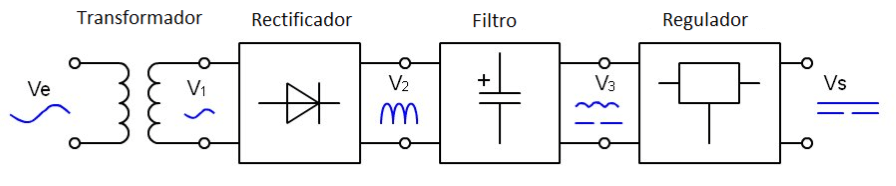 • El diagrama en bloques de una fuente de alimentación lineal puede verse en la figura adjunta. Consta de cuatro partes: Transformador, Rectificador, Filtro y Regulador.
