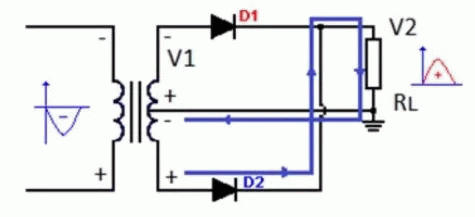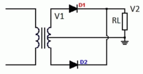 • Este circuito funciona con dos diodos y un transformador especial, con una derivación al medio de su secundario, lo que divide la tensión de salida en dos partes iguales.