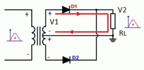 • Vemos entonces una diferencia fundamental con el circuito del rectificador de media onda: la corriente circula por RL tanto en el semiciclo positivo como en el negativo. De esta forma la tensión de salida de este circuito se parece mas a una CC ideal. Sin embargo, este circuito tiene la contra de requerir un transformador de toma intermedia en el secundario, lo que puede encarecerlo un poco.