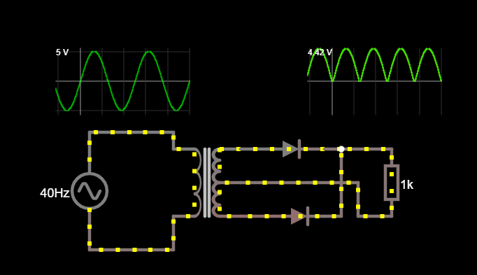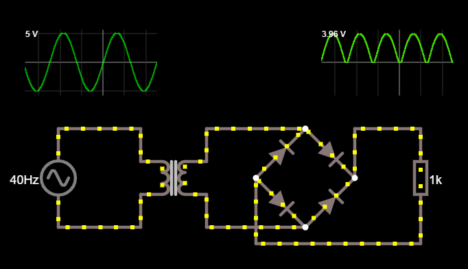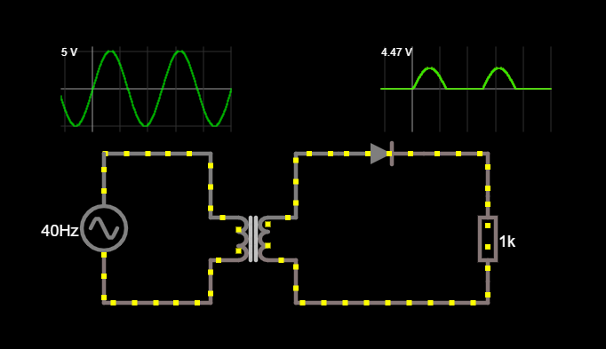 En ella vemos como el diodo deja pasar la corriente cuando la tensión en su ánodo es positiva (verde) pero no cuando es negativa (roja). El transformador en esta simulación tiene una relación de transformación de 1, así que la tensión del secundario es igual a la del primario. Así, se puede ver que la tensión pico en la carga es ligeramente menor a la salida del transformador porque cae un voltaje en el diodo.