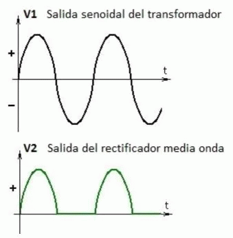 • V1 es la salida del transformador y V2 la salida del rectificador.