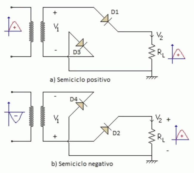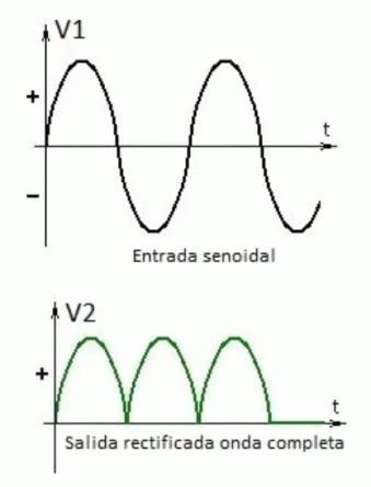 • Como consecuencia de este funcionamiento, la tensión a la salida del rectificador consta siempre de semiciclos positivos, aunque se invierta la polaridad a su entrada. Esto hace que la forma de la tensión sea igual a la del rectificador de onda completa de dos diodos.