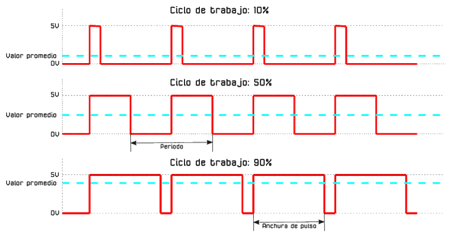- La proporción de tiempo que está encendida la señal, respecto al total del ciclo, se denomina ciclo de trabajo o Duty cycle, y generalmente se expresa en tanto por ciento. En la imagen siguiente vemos señales con distintos ciclos de trabajo.