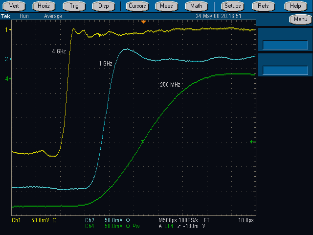 Además como puede verse en la siguiente imagen, cuanto mayor es el ancho de banda, mayor es la precisión en la reproducción de la señal, según se ilustra con una señal capturada a niveles de ancho de banda de 250 MHz, 1 GHz y 4 GHz .