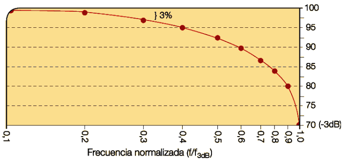 El ancho de banda de un osciloscopio digital, a menudo llamado ancho de banda analógico, viene determinado por sus amplificadores de entrada cuyo comportamiento es equivalente a un filtro paso bajo. El ancho de banda del osciloscopio se define como la frecuencia a la que una señal sinusoidal se presenta atenuada en un 70,7% (-3 dB) respecto a su verdadera amplitud, y se determina,aumentando progresivamente la frecuencia hasta que se observa dicha atenuación, tal como se representa en la curva característica de amplitud-frecuencia adjunta.