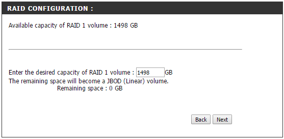Paso 4.- Le indicamos la capacidad que queremos que ocupe el sistema RAID. Le ponemos toda la del disco, en este caso 1498 GB.