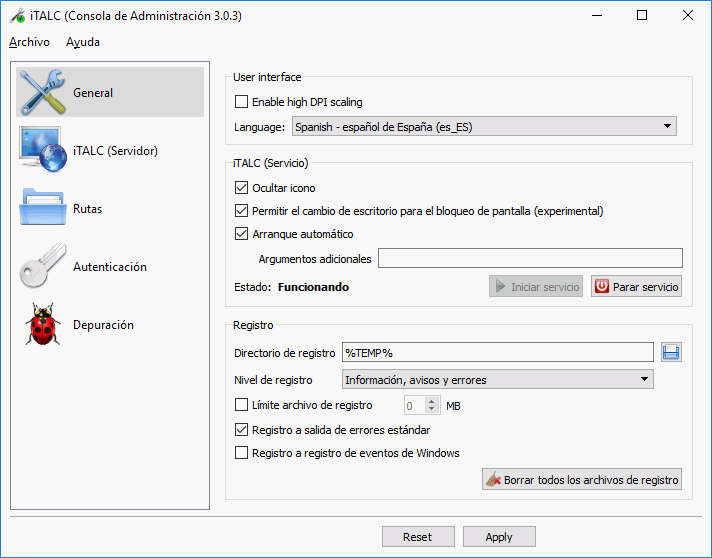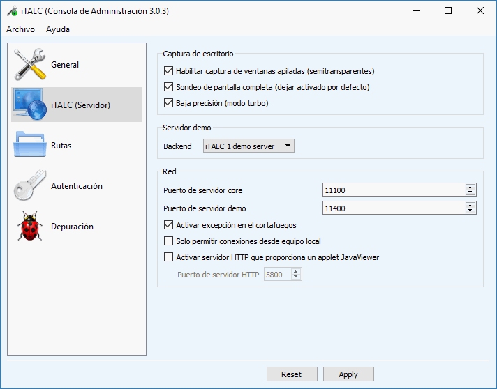- iTALC Servidor → Servidor demo → Seleccionar: