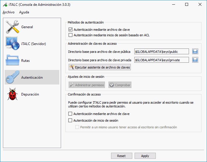 iTALC 1 demo server. - Autenticación → Métodos de autenticación → Desmarcamos