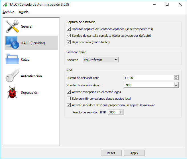 - Consola de configuración > iTALC Server > Demo Server > VNC reflector.