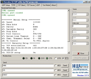 La pestaña Serie de la utilidad Hercules se puede utilizar como un terminal de puerto serie simple para el estándar RS-232. Es similar al Hyperterminal, algunas funciones ampliadas.