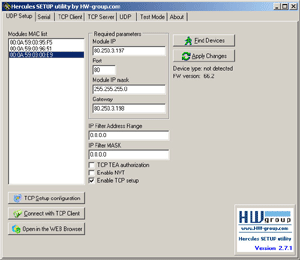 - Botón de configuración TCP Setup. Al hacer clic en este botón se abrirá automáticamente una conexión con el dispositivo a través del puerto 99. En el menú TCP Client verá el modo de configuración del dispositivo. Presione enter para ver los parámetros que puede configurar.