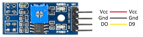Estos sensores suelen proporcionarse con una placa de medición estándar con el comparador LM393, que permite obtener la lectura como un valor digital cuando se supera un cierto umbral, que se regula a través de un potenciómetro ubicado en la placa. Podemos capturar esta señal con las entradas digitales de Arduino.