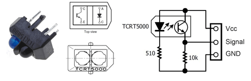 El TCRT5000L es un sensor sencillo. Dispone de un LED emisor de luz infrarroja, y de un fototransitor que recibe la luz reflejada por un posible obstáculo. La cantidad de luz recibida depende del color y reflectividad del objeto, por lo que podemos distinguir entre zonas y oscuras de un objeto.