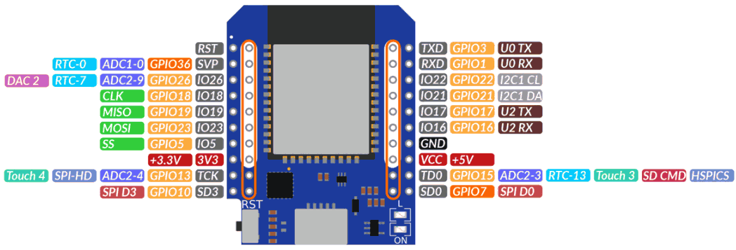 Ver la fuente de esta páginaRevisiones antiguasEnlaces a esta páginaExportar a PDFExportación a ODTVolver arriba Share via Share via... Twitter LinkedIn Facebook Pinterest Telegram WhatsApp Yammer Reddit TeamsImprimir × Público ⇒ Tecnología ⇒ Lenguajes de programación [ESP32] Placa D1 mini ESP32 Patillaje Manuales Patillaje placa D1 mini ESP32 Leyenda de los pines Pines interiores Pines exteriores doc/tec/prg/uc_esp32/d1mini_pin.txt Última modificación: 2025/11/04 21:43por 216.73.216.22